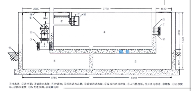 水質(zhì)凈化池池體結(jié)構(gòu)包括進水渠、4座凈化砂濾池、濾后凈水池、反洗污水池,池體凈尺寸20840mn1×14690mmx4420mm(長×寬*高),容積135 3m'3,池壁厚度300mm-500mn,。4座砂濾池交替進行過濾、反洗和化學清洗?;卮ㄋ畠艋幚砗螅?/span>m水進入凈水池,反洗水進入反洗污水池。水質(zhì)凈化池池體結(jié)構(gòu)的設(shè)計斷面如圖l所示。
