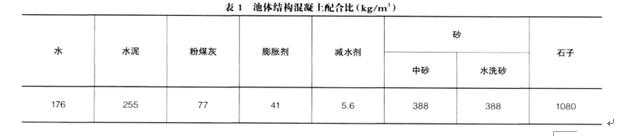 后坍落度13.2cm、14d水中限制制膨脹率0.026%、28d抗壓強度35.4MPa、、水質(zhì)凈化池池體結(jié)構(gòu)混凝土配合比見表1.