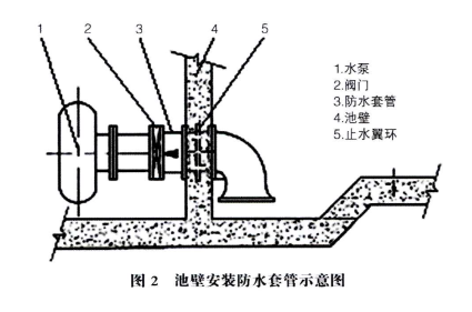為確保管道與池壁接觸處防水效果以及避免水泵等設(shè)備運行時產(chǎn)生振動使接觸處松動,安裝帶有止水翼環(huán)(如圖1中⑩所示)的防水套管(如圖1中⑥所示)。防水套管的安裝與模板、鋼筋的施工同步進行,密切配合,做到高程、位置完全準確,安裝牢固。套管穿越處池壁中的鋼筋彎曲或截斷時,鋼筋與套管焊接相連,套管四周按設(shè)計要求安裝加同筋。防水套管施工如圖2所示。