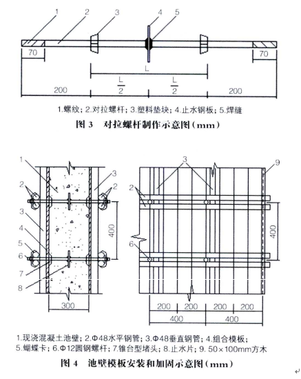 安裝池壁模板至設(shè)汁標高,用對拉螺桿加固;按照設(shè)計要求進行整體找平、校正后擰緊所有螺桿的螺帽;模板所有接縫緊密不漏漿、小錯位。模板支撐系統(tǒng)采用Φ48x3.5鋼管,用對拉圓螺桿和蝴蝶卡固定,模板按400mm×400nlm分布對拉圓鋼螺桿。拆模后拆下螺桿兩頭錐臺型堵頭,將螺桿沿堵頭預留的凹坑底割除,再用防水水泥砂漿抹平模板安裝和加固如圖4所示。